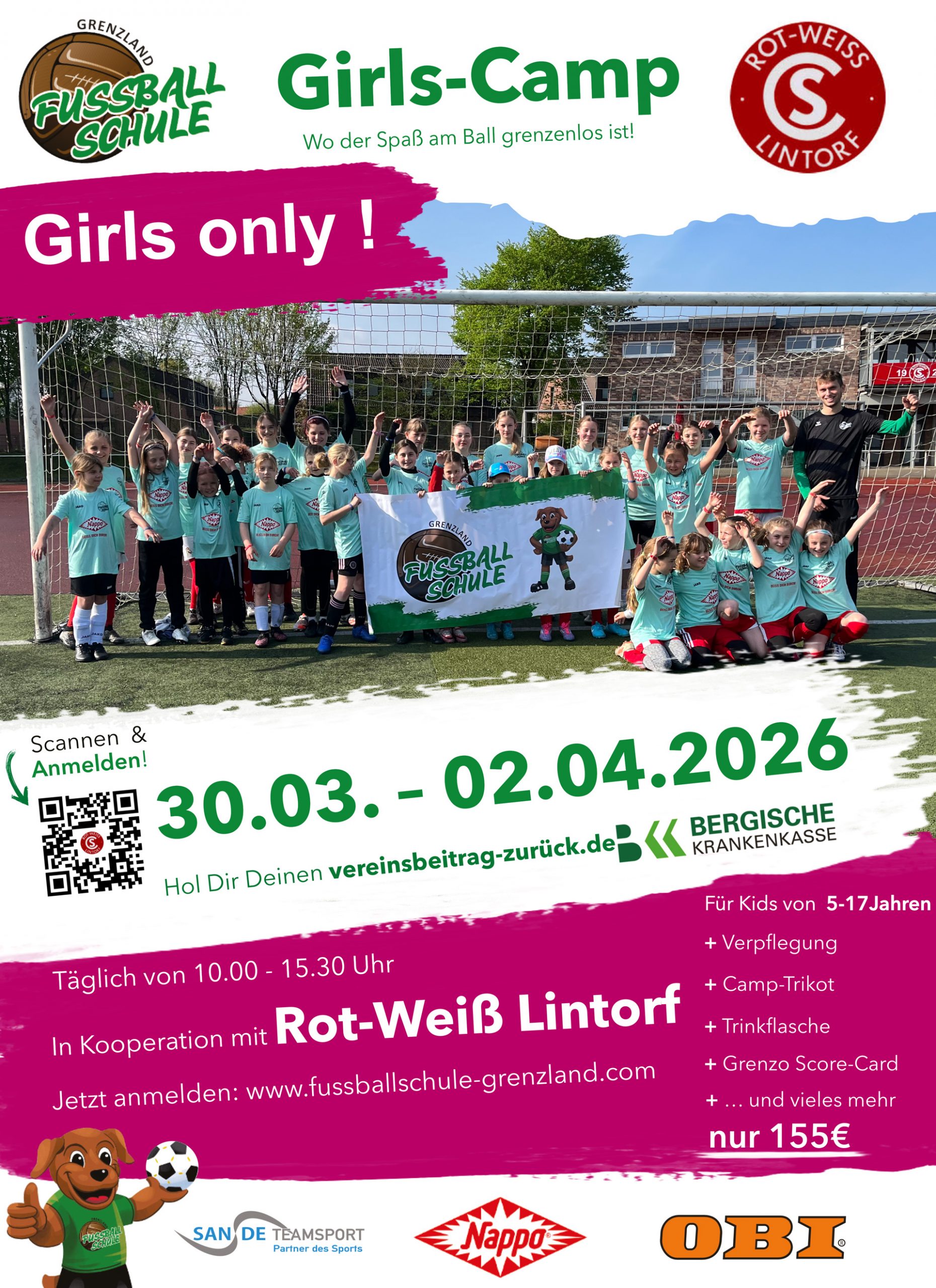 Vom 30. März bis 2. April 2026 gehört unsere Sportanlage ganz den Mädchen. Gemeinsam mit der Grenzland Fußballschule erleben die Teilnehmerinnen ein abwechslungsreiches Fußballcamp mit professionellem Training, spannenden Wettbewerben und vielen gemeinsamen Erlebnissen.